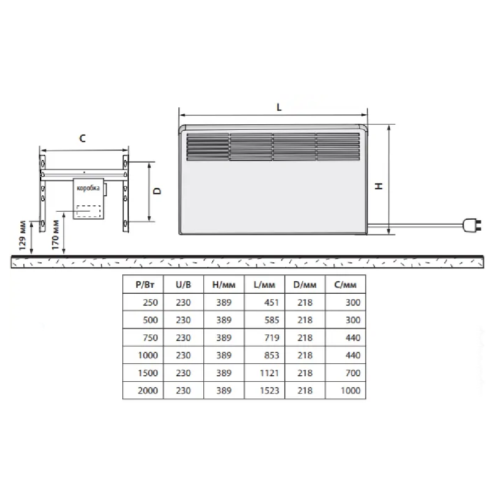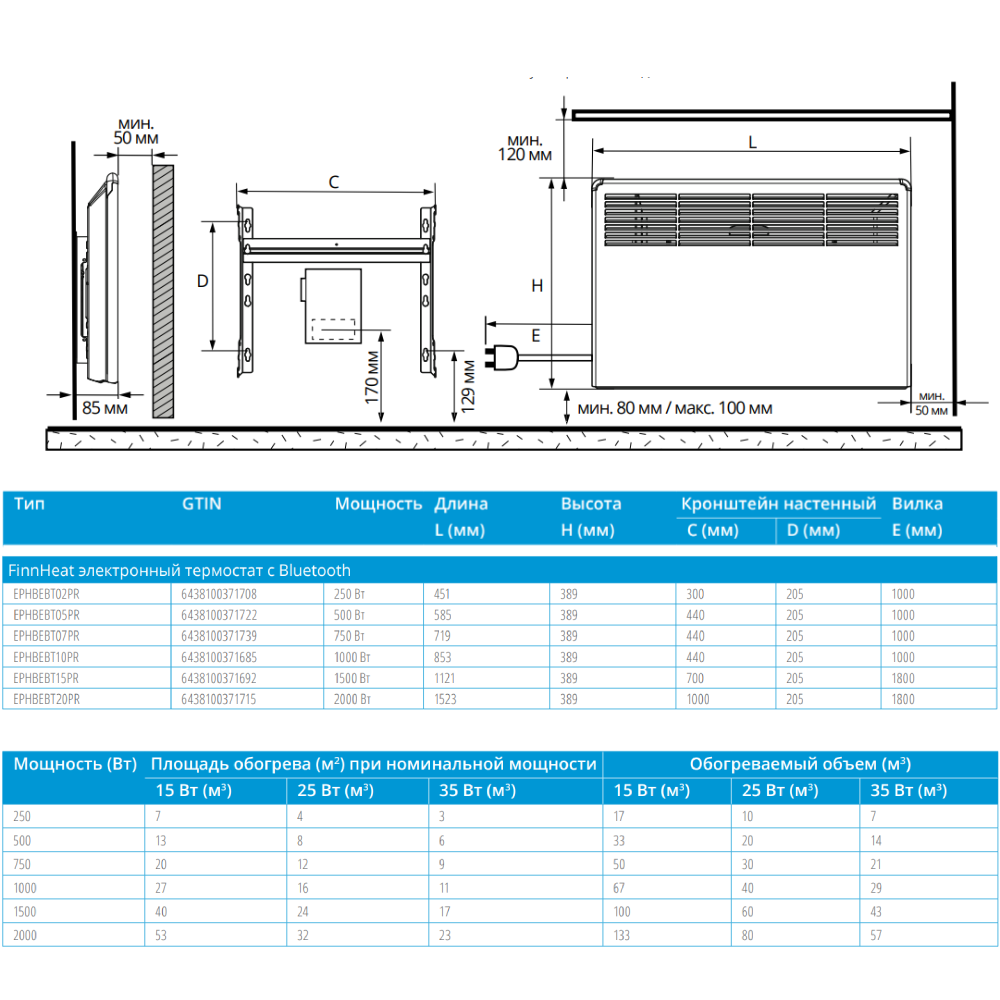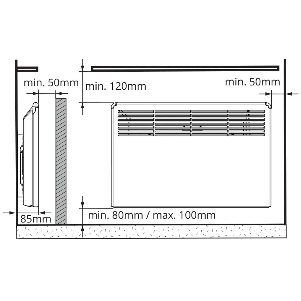 Правильный монтаж – это залог безопасности, долгого срока службы электроконвектора и корректной работы термостата. При монтаже на стену соблюдайте расстояния, указанные на схеме (см. техническую документацию).